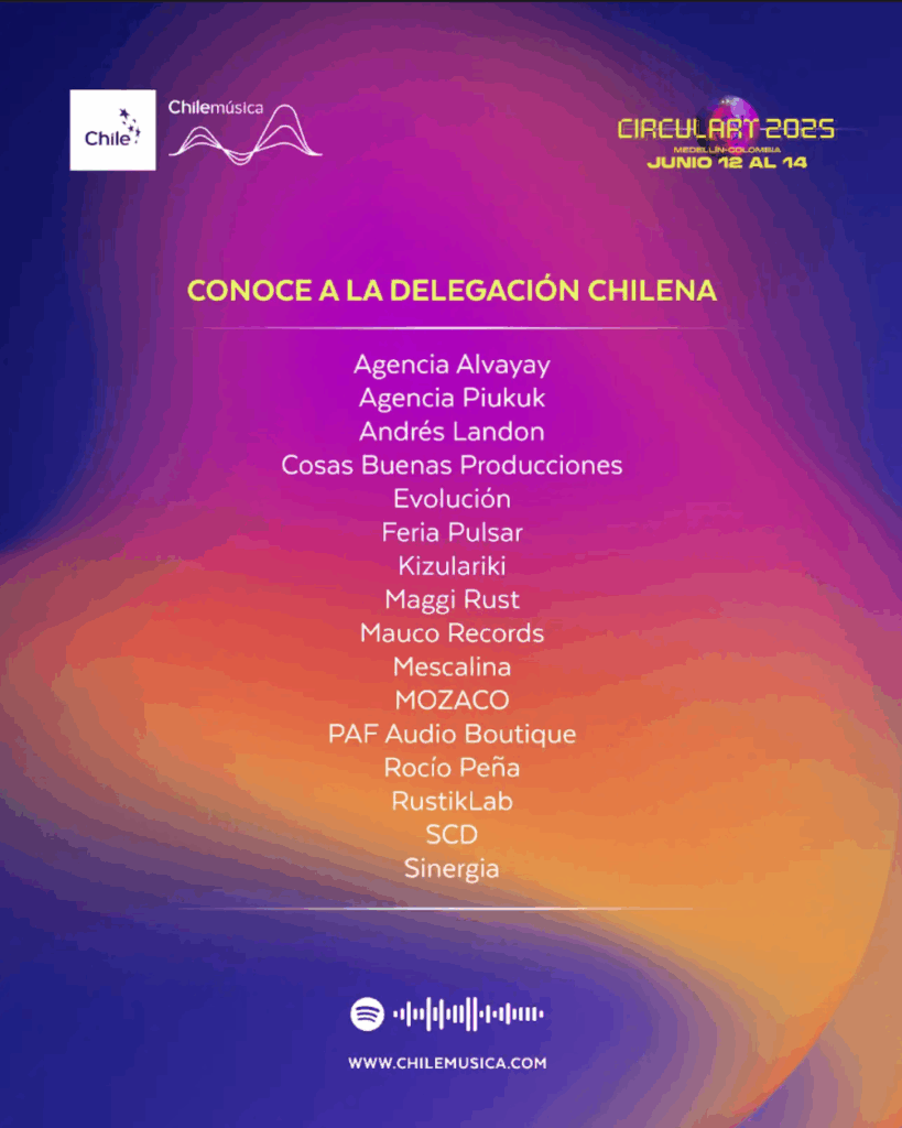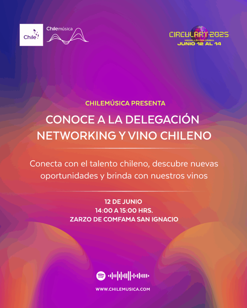 Del 12 al 14 de junio, Chilemúsica participará en Circulart 2025, uno de los principales mercados culturales de América Latina. En su 16ª edición, en Medellín, artistas, productores, agencias y organizaciones se dan cita dialogar y generar redes en torno a la música y las industrias creativas. Desde Chile, Chilemúsica llegará con una delegación de 15 representantes —entre sellos discográficos, agencias, productoras, artistas y plataformas y con el respaldo del Ministerio de las Culturas, las Artes y el Patrimonio y ProChile.